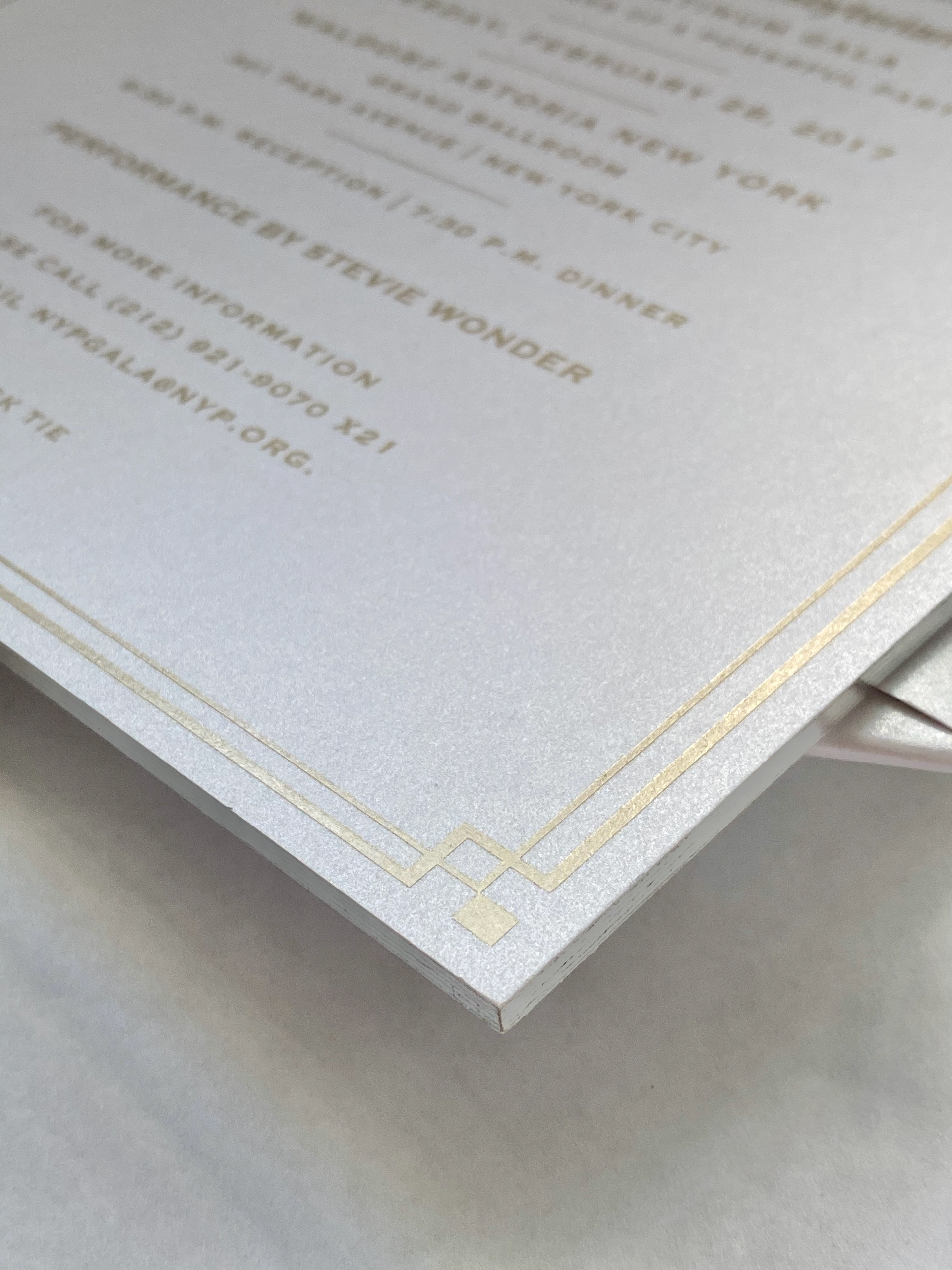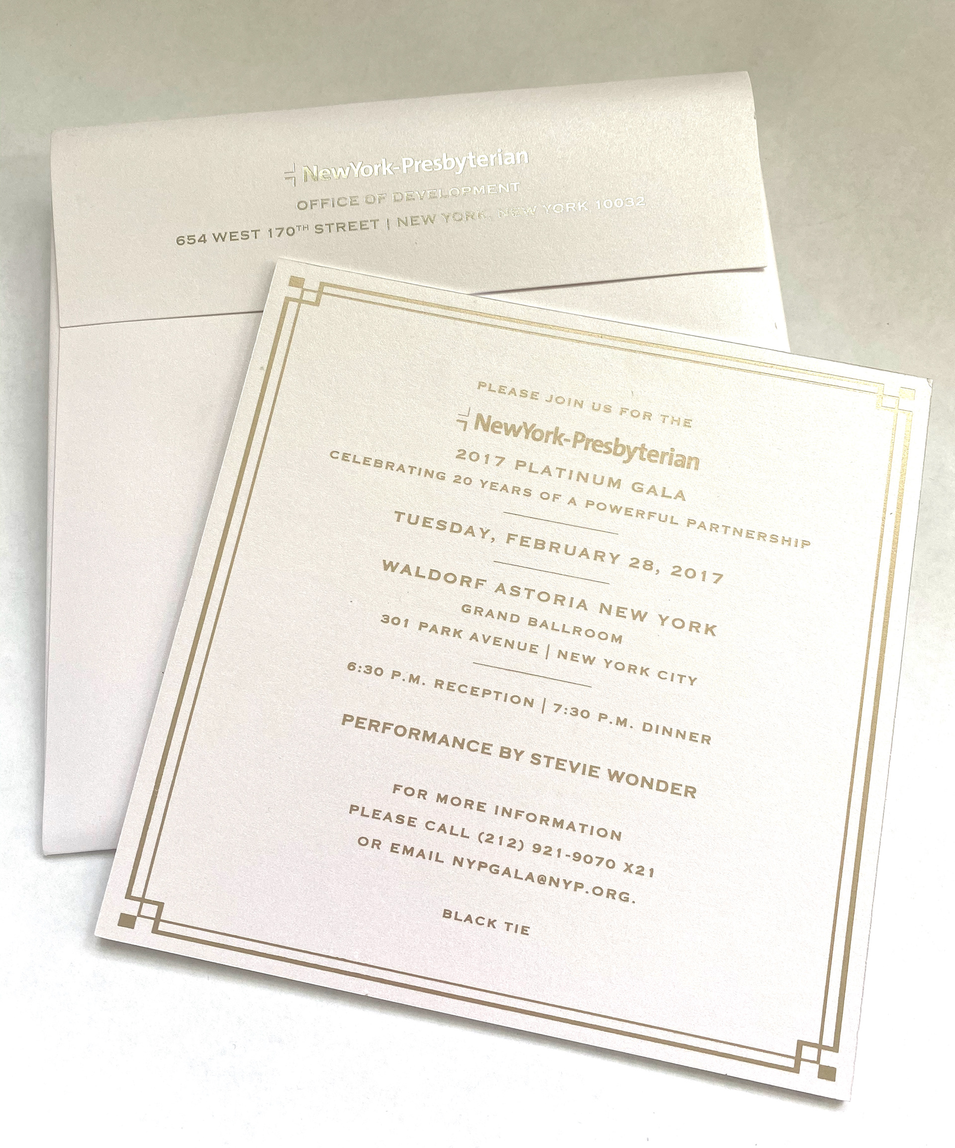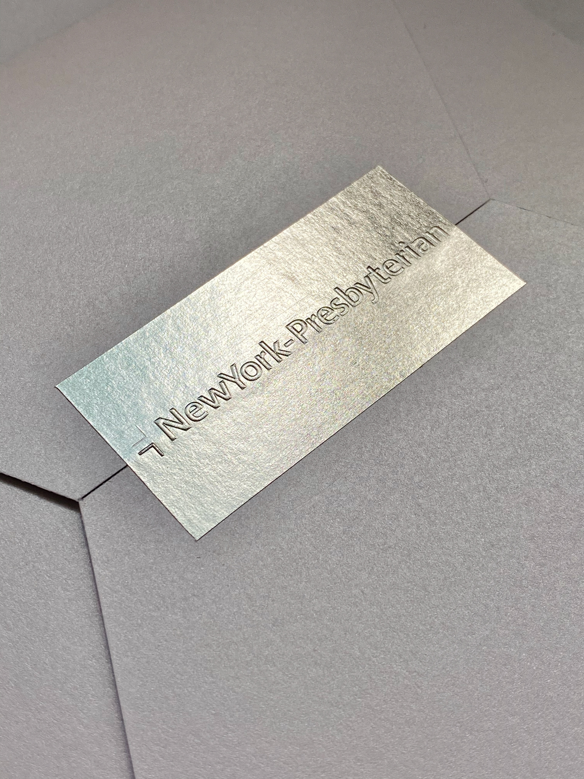 In celebration of the hospital's 70th anniversary, the invitation was foil stamped and triple mounted with platinum colored edging; the journal was hard cover, cloth-bound with foil stamping on the cover. The pieces became keepsakes.